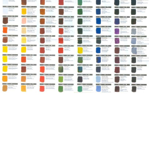 103 Giallo di Marte Trasparente -- 116 Giallo Primario -- 250 Rosso di Marte Trasparente -- 256 Rosso Primario - Magenta -- 322 Verde Cupro Chiaro -- 324 Verde Cupro Scuro -- 325 Verde di Hooker -- 333 Verde Oro -- 336 Verde Ossido di Cromo -- 350 Verde Turchese -- 356 Verde Paolo Veronese -- 359 Blu di Berlino -- 377 Blu di Faenza -- 391 Blu Oltremare Chiaro -- 392 Blu Oltremare Scuro -- 400 Blu Primario - Cyan -- 405 Blu Reale Chiaro -- 407 Blu Reale Scuro -- 409 Blu Verde -- 436 Lacca Viola -- 440 Oltremare Violetto -- 473 Violetto Verzino -- 477 Bruno di Marte Trasparente