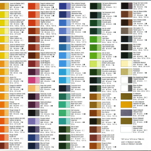 601 Giallo di Napoli imit. -- 411 Giallo Hansa Chiaro -- 412 Giallo Medio -- 830 Giallo di Cadmio Medio imit. -- 163 Giallo di Cadmio Scuro imit. -- 730 Giallo Turner -- 414 Giallo Oro -- 324 Giallo Indiano -- 720 Arancio di Cadmio imit. -- 510 Rosso di Cadmio Chiaro imit. -- 151 Rosso di Cadmio Medio imit. -- 294 Rosso Naftol Carminio -- 311 Rosso di Cadmio Scuro imit. -- 500 Magenta Medio -- 810 Rosa Ritratto Chiaro -- 391 Viola Prismatico -- 186 Porpora -- 381 Blu di Cobalto imit. -- 320 Blu di Prussia imit. -- 382 Blu Oltremare Scuro tonalità rosso -- 380 Blu Oltremare Scuro tonalità verde -- 680 Viola Porpora Chiaro -- 316 Blu Ftalo tonalità verde -- 314 Blu Ftalo tonalità rosso -- 470 Blu Ceruleo imit. -- 570 Blu Brillante -- 561 Turchese Scuro -- 315 Verde Vescica Permanente -- 317 Verde Ftalo tonalità Blu -- 319 Verde Ftalo tonalità giallo -- 350 Verde scuro Permanente -- 398 Vrde Smeraldo Permanente imit. -- 327 Verde Smeraldo Trasparente imit. -- 450 Verde Smeraldo -- 312 Verde Chiaro Permanente -- 740 Verde Vivo Limone -- 166 Verde Ossido di Cromo -- 225 Verde di Hooker Scuro Permanenteimit. -- 224 Verde di Hooker Permanente imit. -- 333 Terra d'Ombra naturale Trasparente -- 335 Rosso di Marte -- 335 Rosso di Marte -- 392 Rosso Van Dick -- 130 Terra d'Ombra Bruciata Trasparente