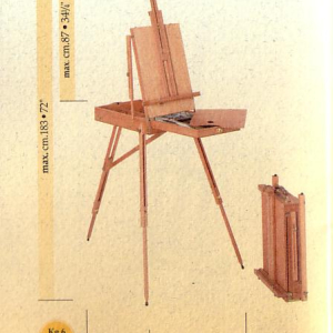 Ideale per chi vuole dipingere sia in casa che all'aperto. Di minimo ingombro quando é chiusa. Dotata di capiente cassetto, permette di trasportare contemporaneamente una notevole quantità di colori e pennelli e una tela ancora fresca di h.max cm.80 Portatele regolabile in altezza. interamente in faggio evaporato ed oliato, ferramenta in acciaio ottonato. Tre piedi a scomparsa estensibili ne permettono il posizionamento su qualsiasi terreno.Maniglia in pelle per il trasporto. Produzione nazionale di ottima qualità.