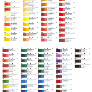 058 Arancio Indanthrene -- 075 Giallo Brillante Chiaro -- 076 Giallo Brillante Scuro -- 106 Giallo di Napoli Rossastro -- 107 Giallo di Napoli Scuro -- 109 Giallo di Nichel Titanio -- 124 Gomma Gutta imit -- 167 Carminio Permanente -- 175 Lacca di Garanza Chiara -- 176 Lacca di Garanza Rosa -- 177 Lacca di Garanza Rosa Antica -- 178 Lacca di Garanza Permanente Scura -- 179 Lacca Geranio -- 181 Lacca Granata -- 183 Lacca Magenta -- 184 Lacca Solferino -- 212 Rosa Quinacridone -- 258 Rosso Quinacridone -- 290 Lacca Verde -- 336 Verde Ossido di Cromo -- 339 Verde Permanente Chiaro -- 340 Verde Permanente Scuro -- 348 Verde Smeraldo -- 380 Blu Indanthrene -- 436 Lacca Viola -- 454 Violetto Indanthrene -- 458 Violetto di Manganese -- 466 Violetto Quinacridone -- 474 Bruno di Garanza