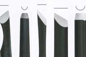 Set di sgorbie in acciaio temperato per linoleografia. Data la particolare durezza del materiale, queste sgorbie possono essere usate anche per l'incisione su legno e risultano quindi adatte per la xilografia.